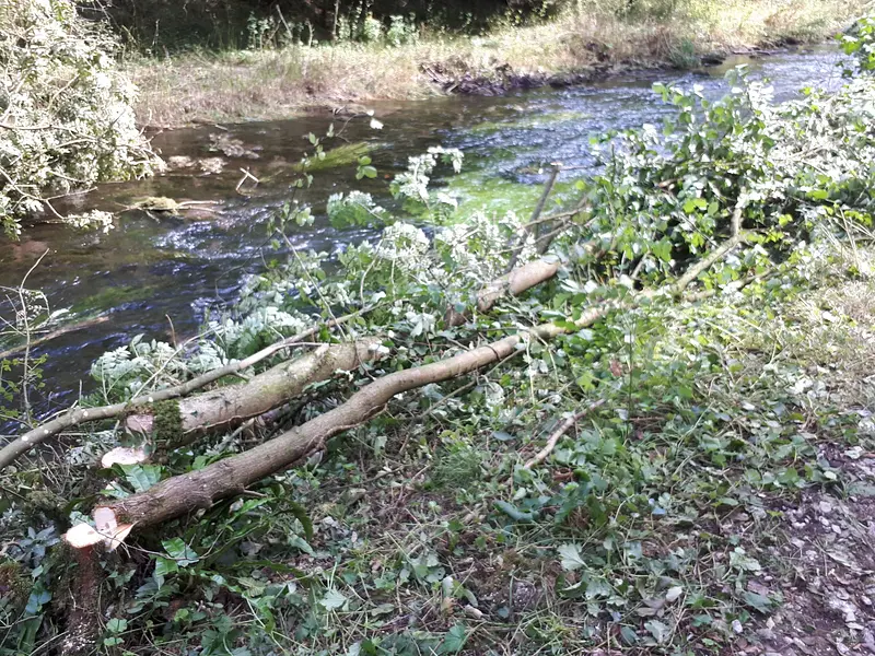 We used tree branches and other woody material to redirect the river along an old, seasonal stream, bypassing the weir. The addition of natural barriers created a slip stream, directing water and trout to the new waterway.